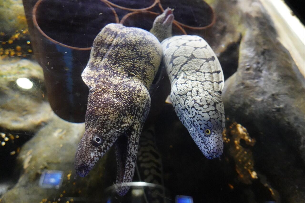 ウツボは、穴がいっぱいあるのに、なぜか一か所に3匹かたまっていました💦。