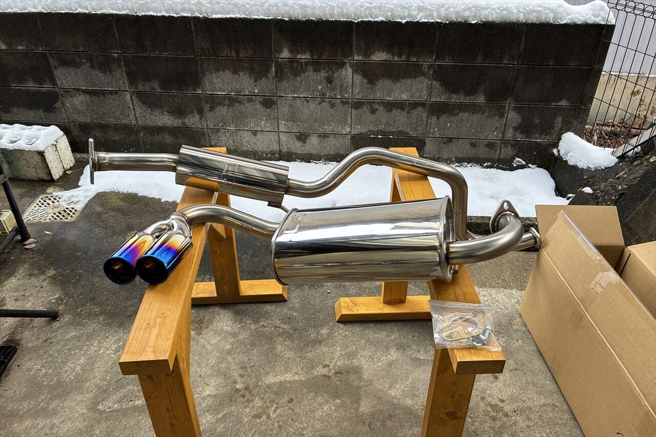 車検対策でスポーツ触媒から純正触媒に戻しましたが、単にグレードダウンすると悲しいので、中間パイプ付きのスポーツマフラーに交換することにしました。