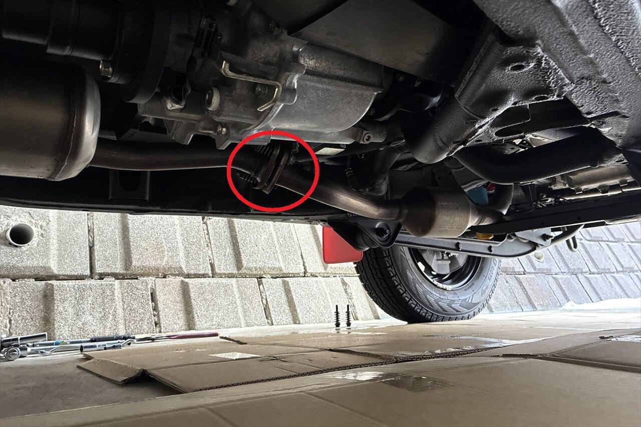 - 中間パイプの固定ゴムハンガーの位置を確認します。(まだ取らない)