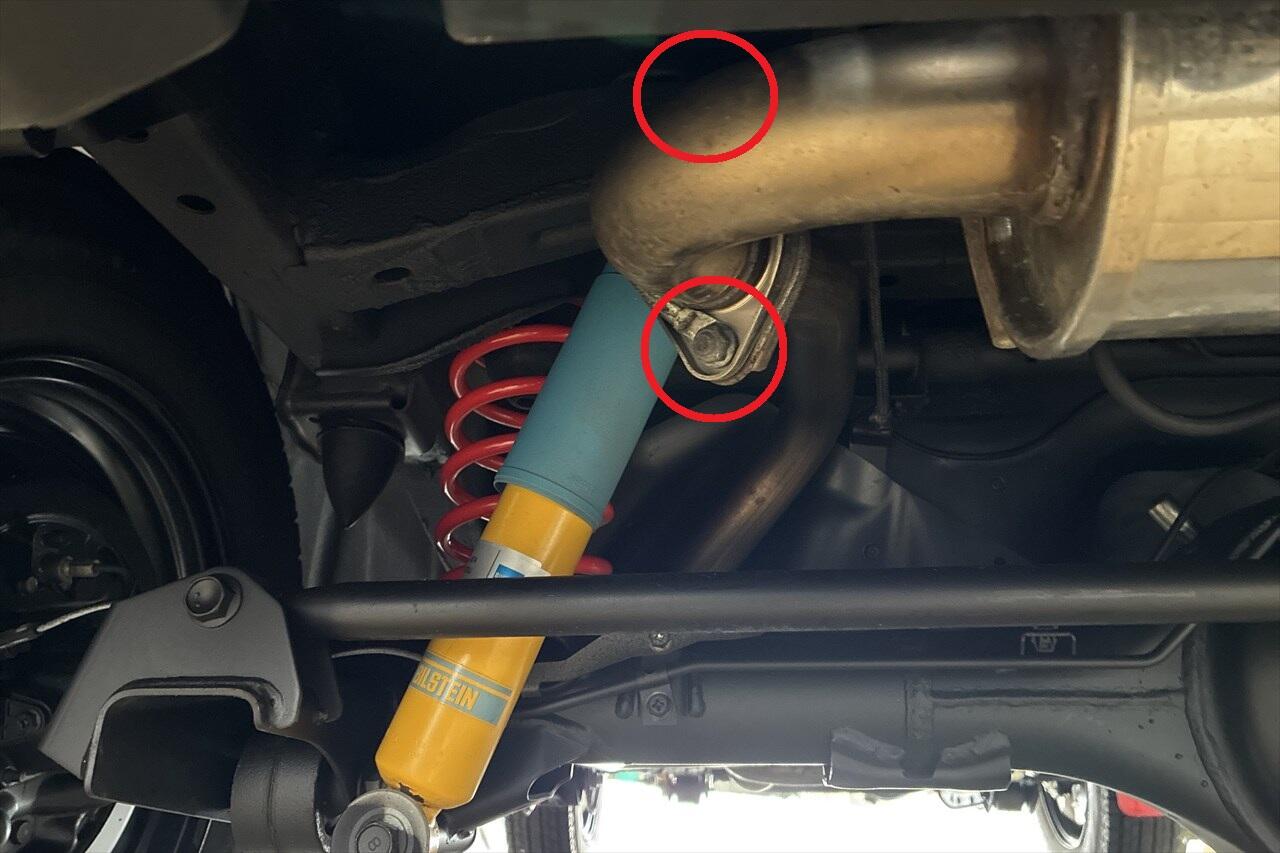 - フロントパイプと中間パイプの接合部のスプリングボルトを外します。(固い場合はCRC556を吹き付ける)