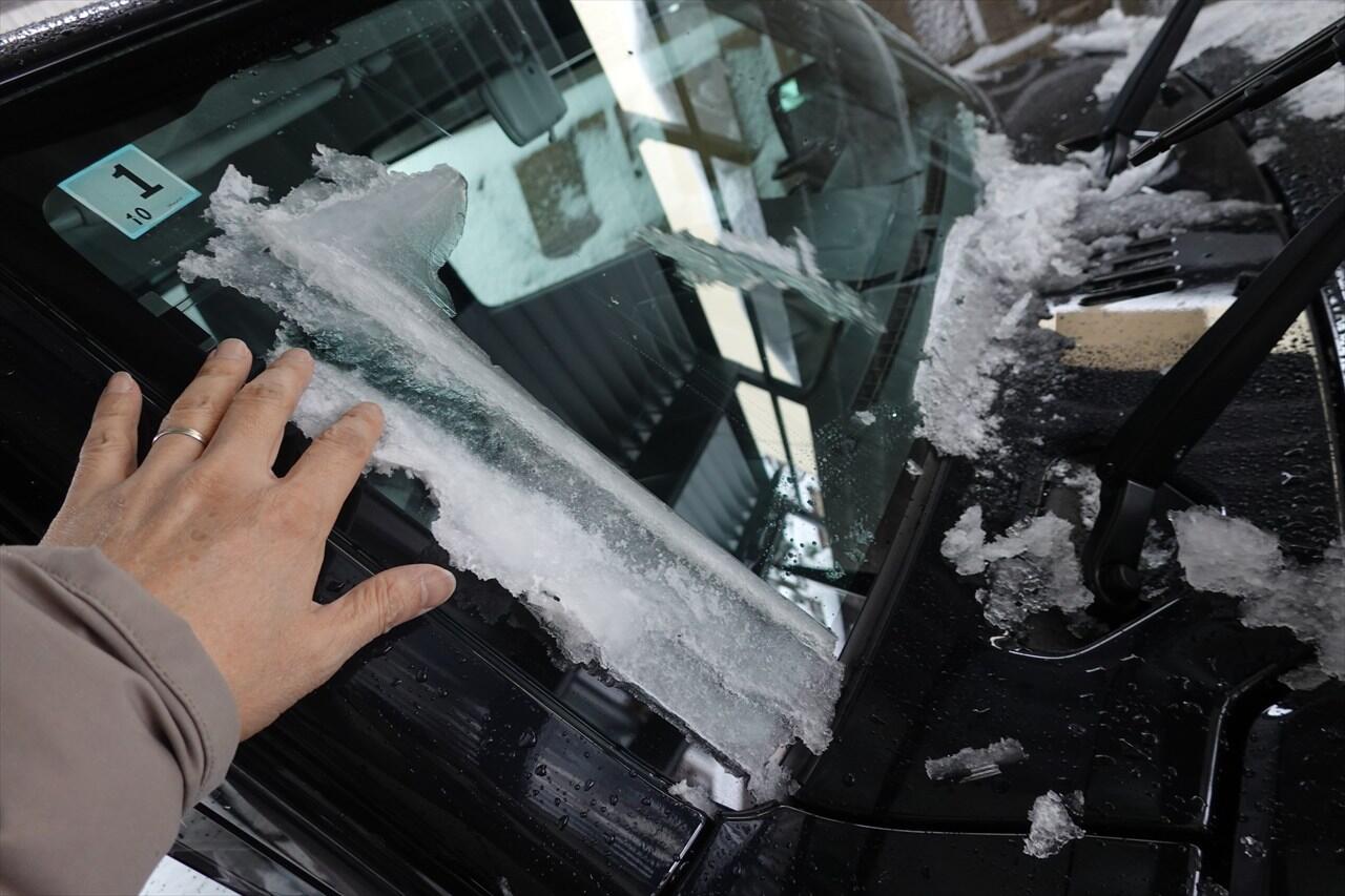さすが気温マイナスなので、フロントガラスは凍ってました。