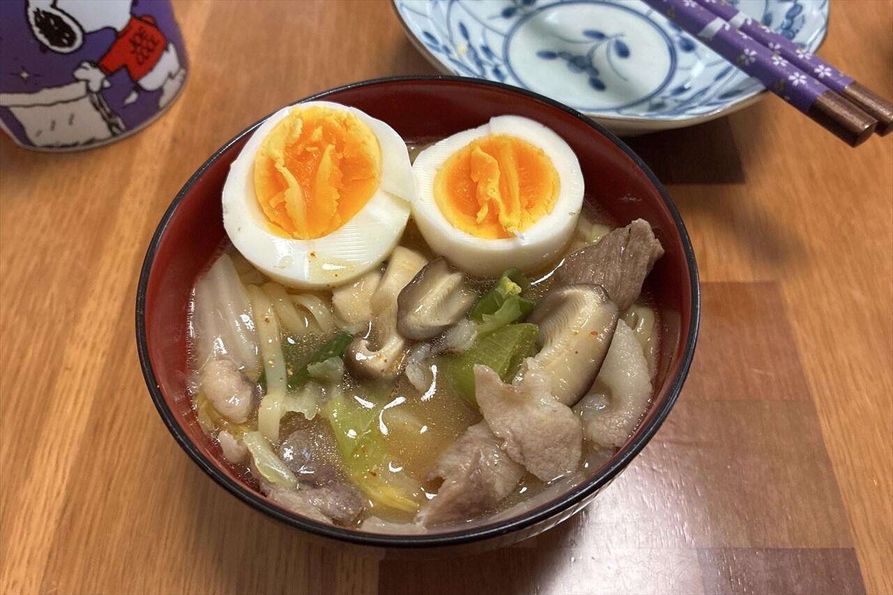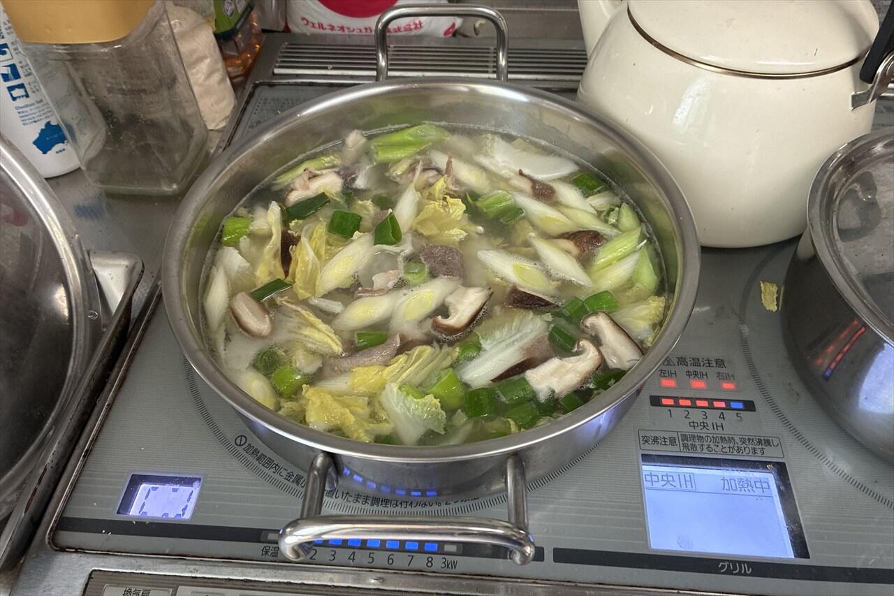 家族4人分の野菜をかさ増しするのが面倒くさかったので、逆に鍋で煮込んだ野菜汁の中にラーメンをぶち込む作戦で行きました。